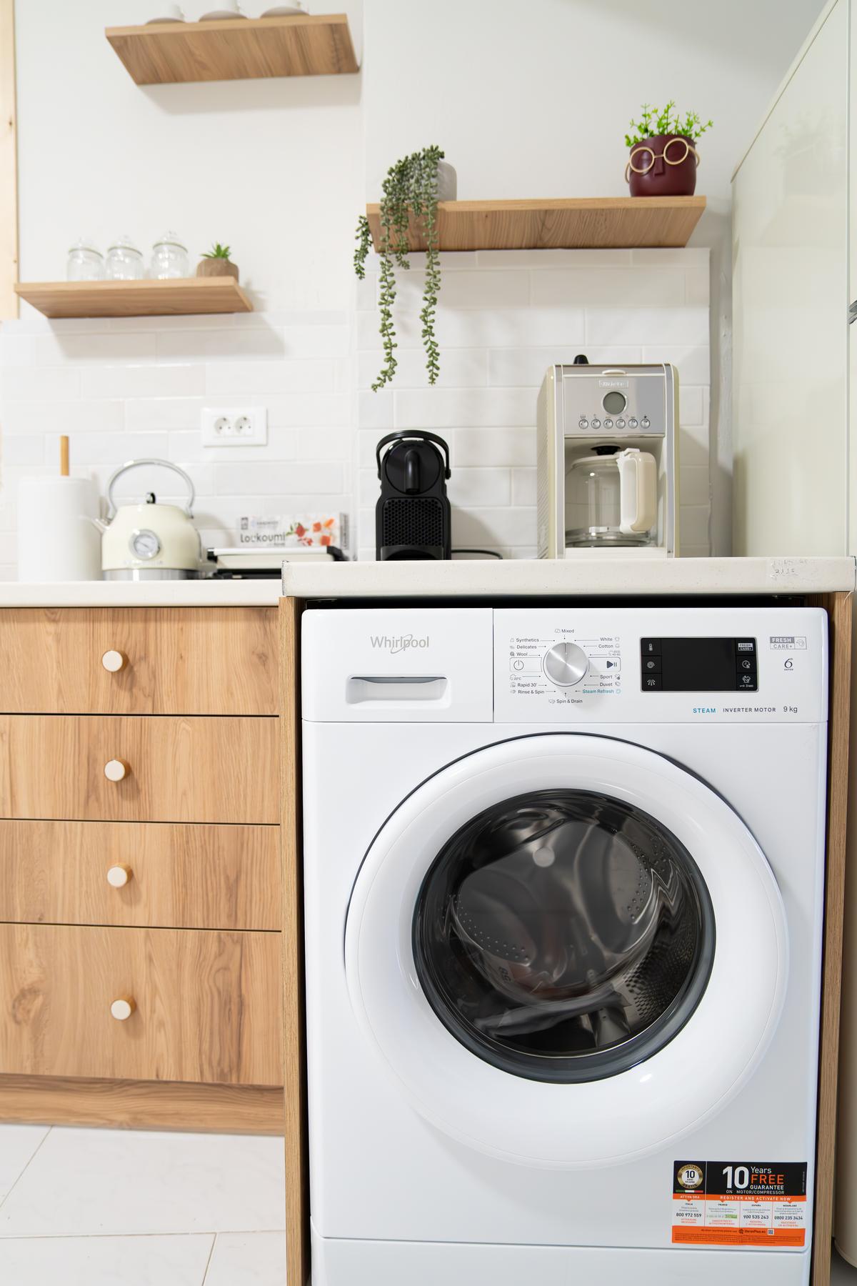 The kitchen is fully equipped with everything you need to cook your own meals. It has a fridge, cooking utensils, plates and cutlery, as well as a coffee maker.